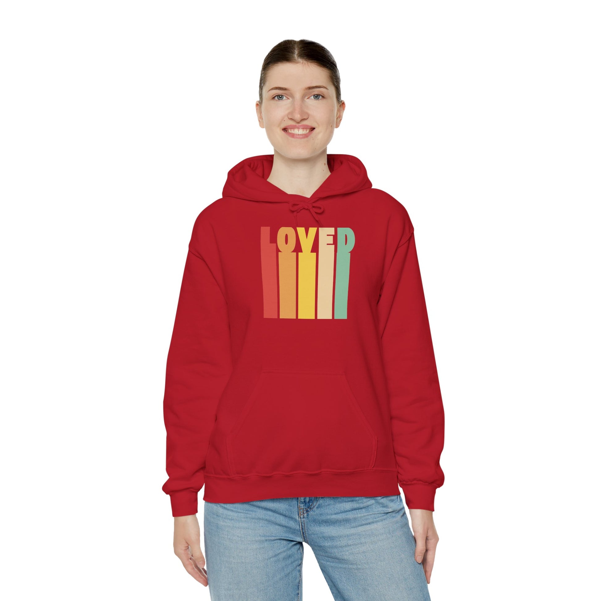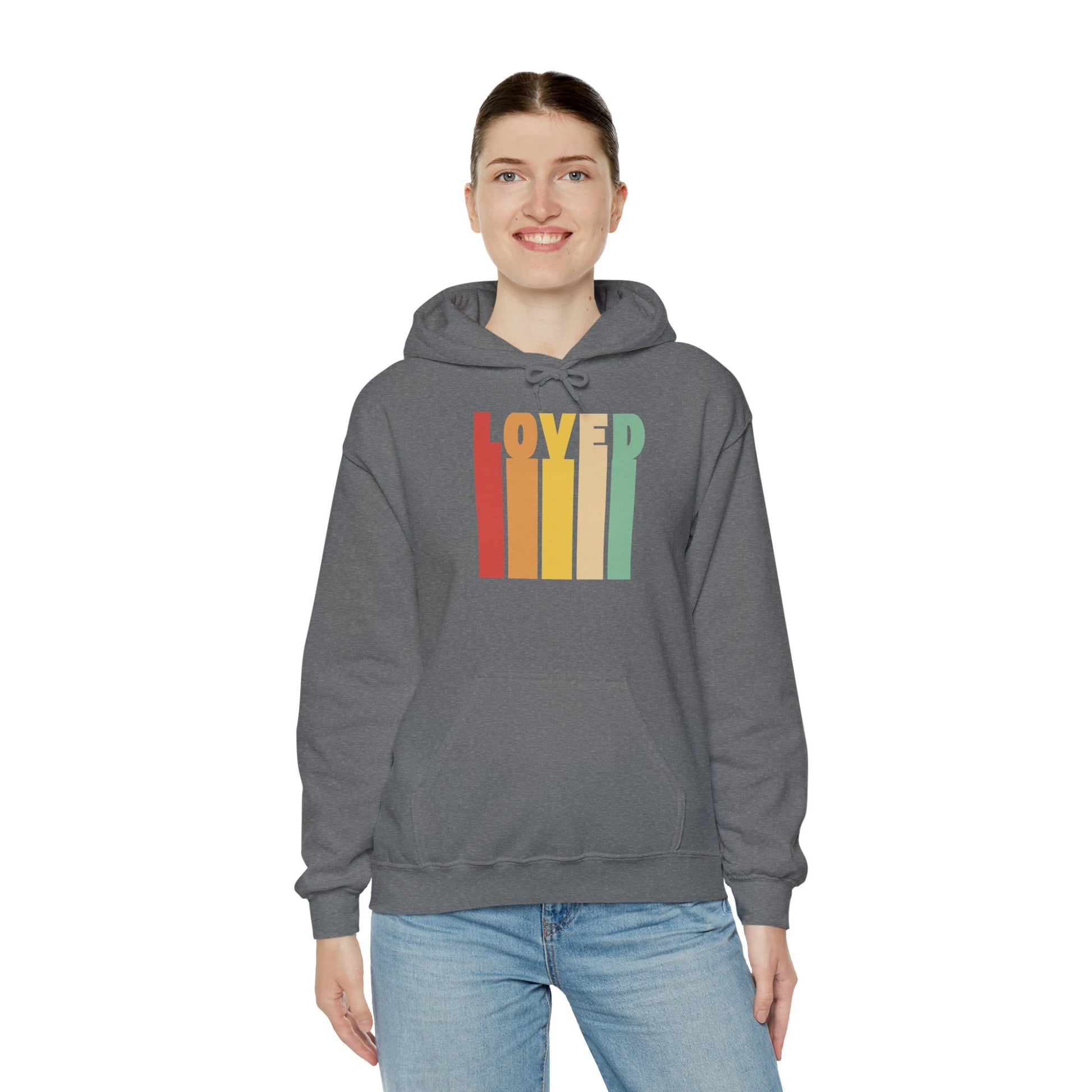 A 'LOVED' hoodie perfect for staying cozy and stylish. This unisex heavy blend hooded sweatshirt features spacious pockets to keep your hands warm and an adjustable drawstring hood. It is ideal for adults looking for a comfortable and versatile clothing option, great for casual wear or lounging at home.